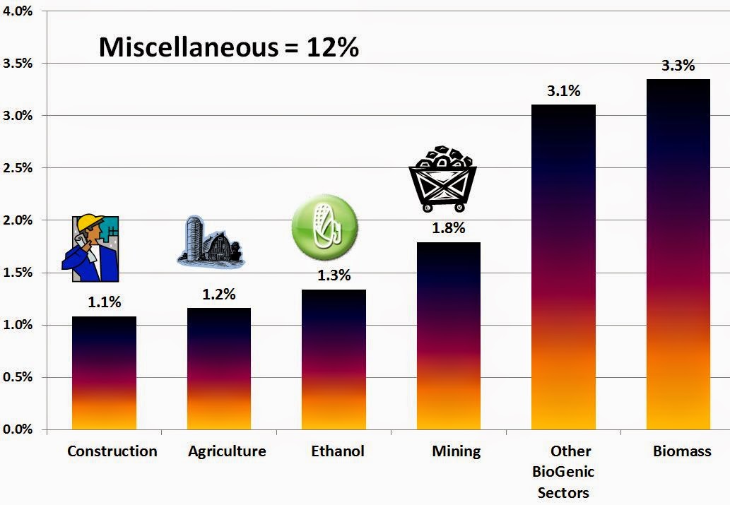 Miscellaneous: Everything else accounts for 12% of GHG. (Click graphics to enlarge)That 12% includes much maligned agriculture. Some think that if everyone became vegans and stopped drinking milk, our climate would be saved. Not even close. Farming is 1.2% of GHG emissions and some of that comes from transporting food to the stores. Farm animals emit 25% of the GHG as methane but much of that can be (and sometimes is) recaptured and used for power generation. Of the GHG from dairy farms, 25% is methane, 25% is from transport, and the rest is from farm machinery, lighting, heating, etc.. The dairy industry agreed to cut GHG emissions 25%. Nothing wrong with being a vegan, but it won't do much to stop GHG emissions. (Click picture to enlarge)